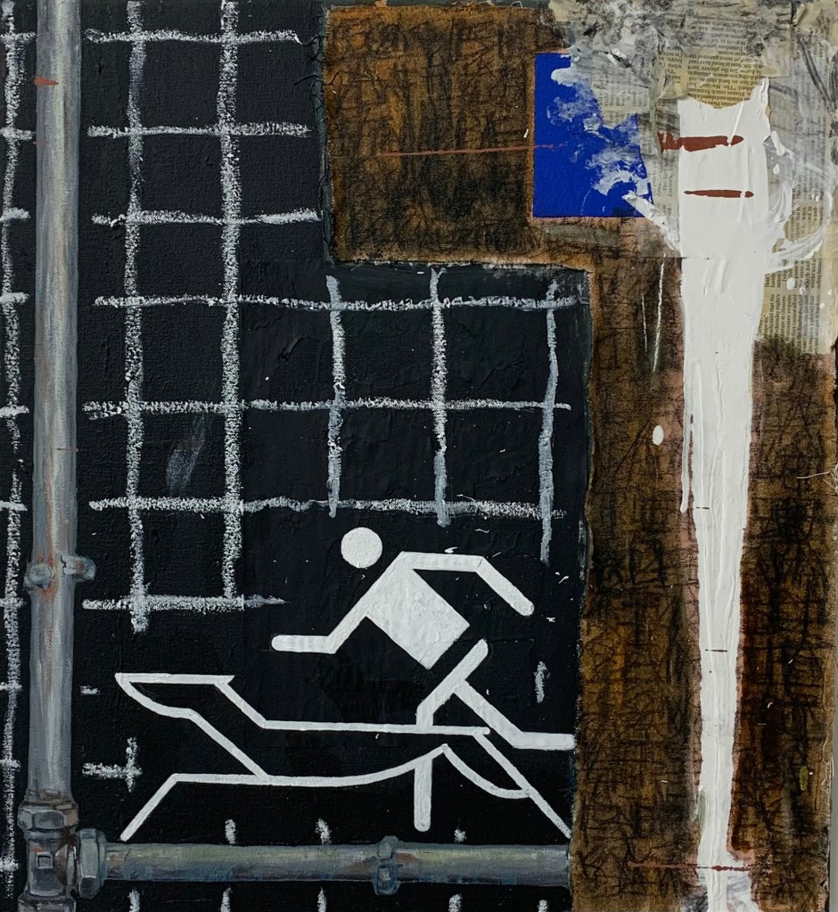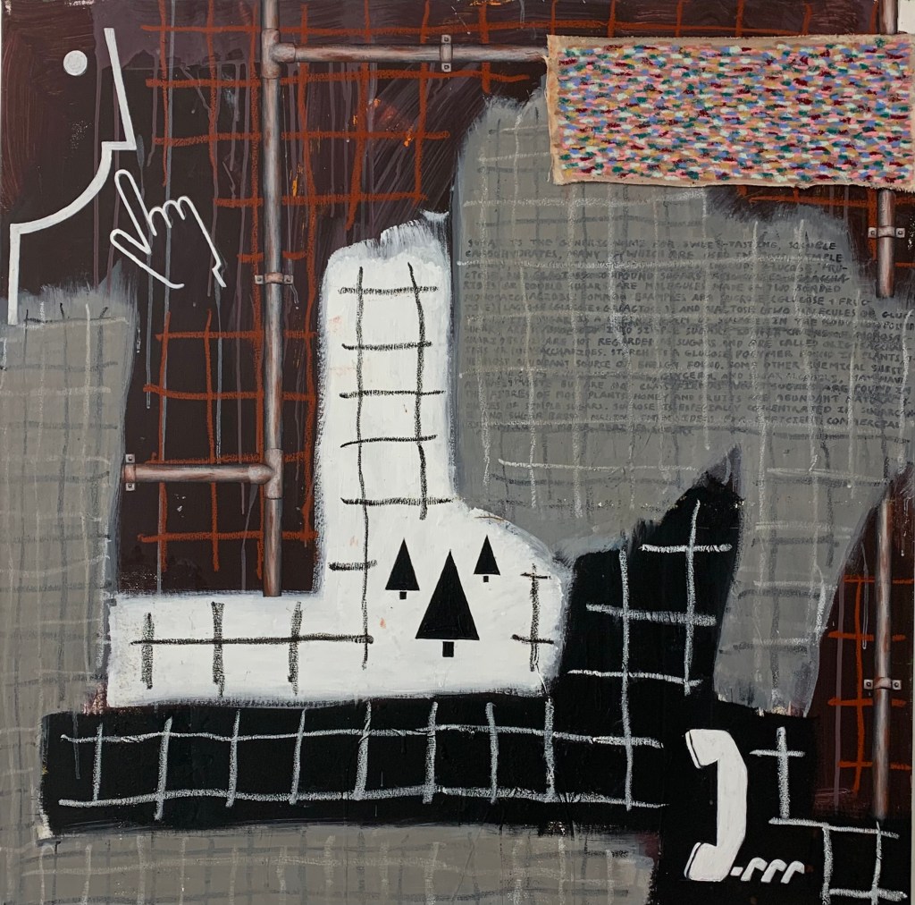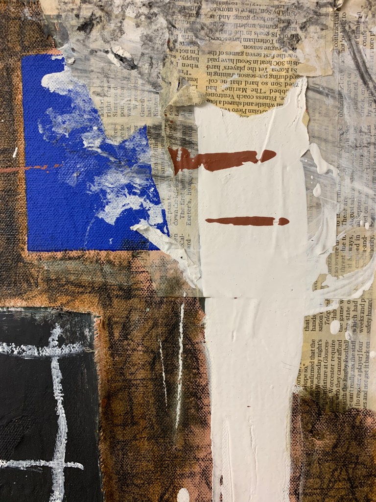 Acrylic, oil stick, and newspaper on canvas